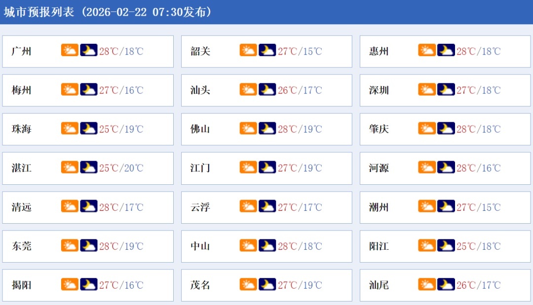 预计未来三天,粤北偏北市县多云转阴天,渐转雨雾天气,珠三角和粤东市县,云量增多,间中有分散小雨,粤西市县以多云间阴的天气为主,间中局部有零星小雨。另外,2月24日白天到夜间,有弱冷空气南下我省,气温小幅下降。